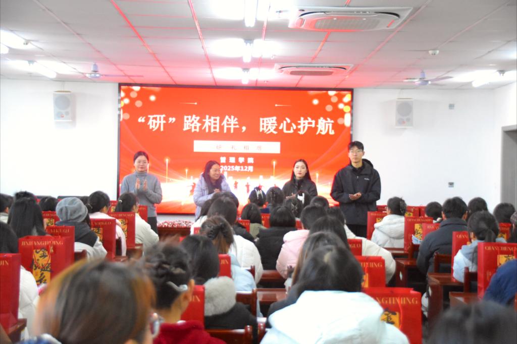为有效舒缓考研学子临考压力,切实传递学院关怀,管理学院于12月5日在双创楼408会议室开展“研”路相伴,暖心护航系列活动之“研”礼相赠活动,学院党委副书记刘璐璐,就业专员荣翊贝、卢鑫、陈玉等老师出席,为在场备考的毕业班学生加油鼓劲并赠送暖心礼包。