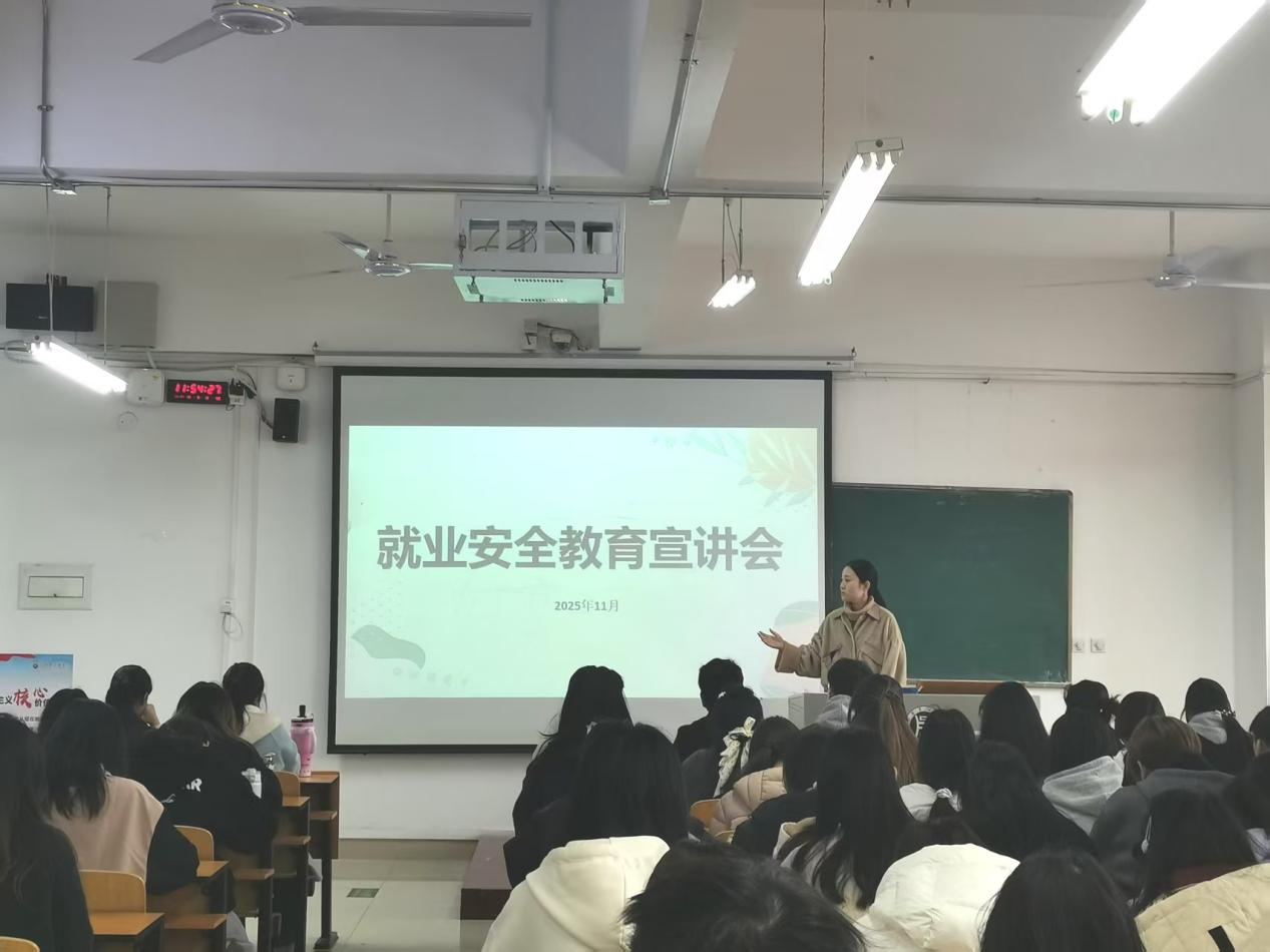 为进一步加强毕业生就业安全意识,提升求职风险防范能力,保障毕业生合法权益,11月12日,管理学院在二教203召开就业安全教育宣讲会,本次宣讲会由学院就业专员荣翊贝老师主讲,2026届毕业生积极参与。