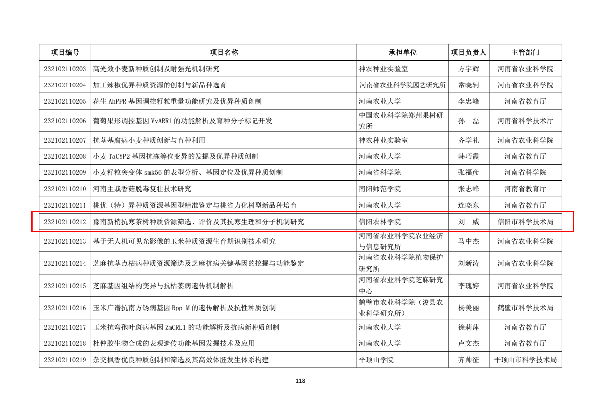 3月14日,河南省科技厅发文(豫科〔2023〕26号)下达了河南省二○二三年科技发展计划的通知,茶学院刘威申报的“豫南新梢抗寒茶树种质资源筛选、评价及其抗寒生理和分子机制研究”被批准为河南省科技攻关项目(项目编号:232102110212)。(撰稿人:刘威 审核人:陈义)
