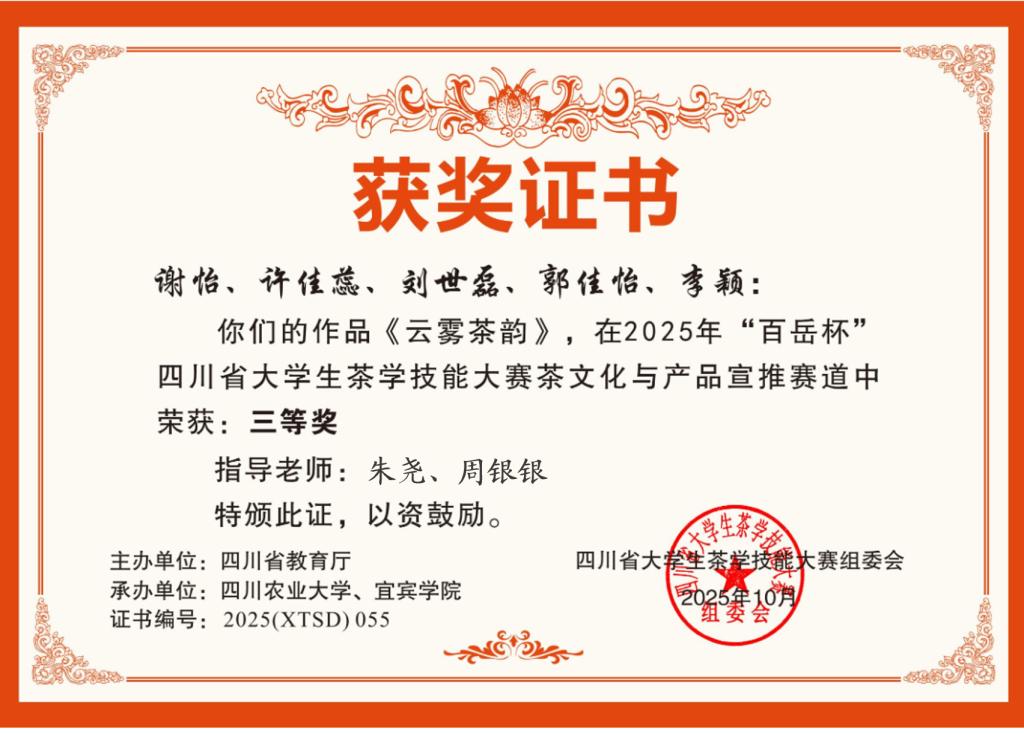 我院在2025年“百岳杯’四川省大学生茶学技能大赛中荣获三等奖