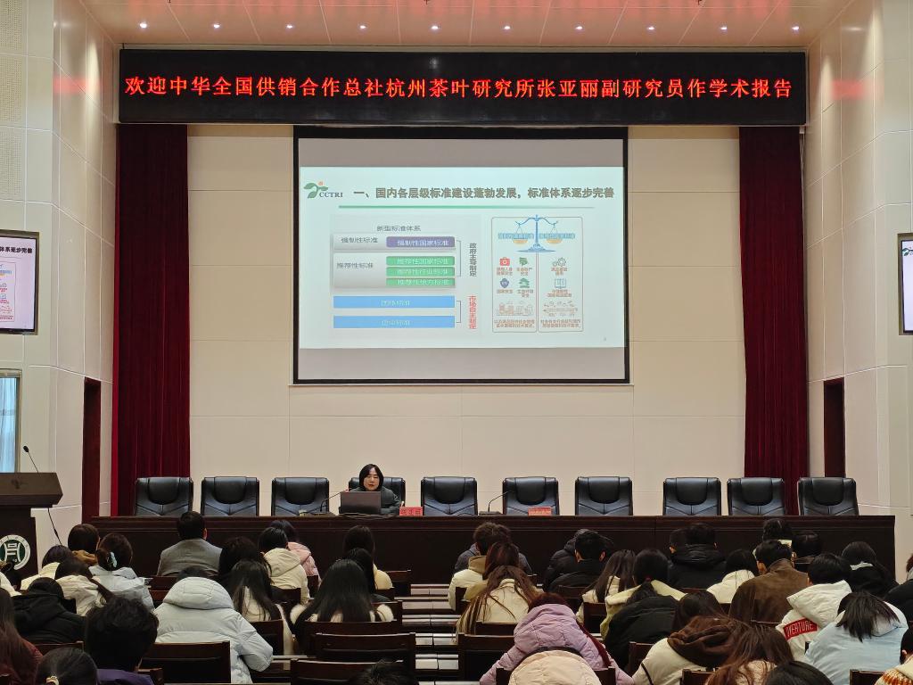 2025年12月30日下午3时,应茶学院邀请,中华全国供销合作总社杭州茶叶研究所标准中心副主任张亚丽副研究员莅临我校,在学术报告厅作了题为“致力标准建设 赋能高质量发展——我国茶叶标准化建设现状与重点标准介绍”的专题学术报告。浉河区茶办、茶企代表、茶学院师生等200余人参加了报告会,报告会由茶学院院长孙慕芳主持。