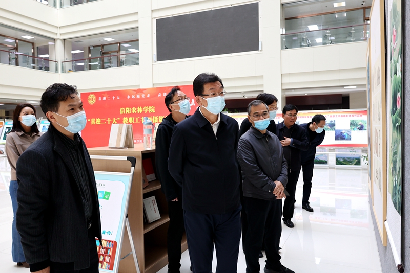10月31日上午,党委书记余作斌,党委副书记、工会主席王庆兵到图书馆参观我校“喜迎二十大”教职工书画摄影优秀作品展。党委宣传部、校工会、图书馆负责人陪同参观。