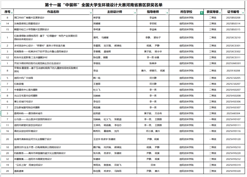 近日,第十一届“中装杯”全国大学生环境设计大赛河南赛区获奖名单正式公布。我院学子凭借扎实的专业功底与创新设计思维,在此次赛事中表现卓越,我校荣获优秀组织奖,学生作品共25项从全省千余份投稿中脱颖而出,其中一等奖4项、二等奖10项、三等奖11项,优秀指导教师2项,充分展现了我院在教学实践与人才培养方面的显著成效。