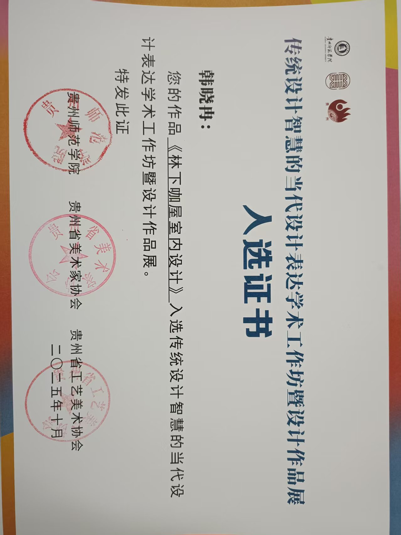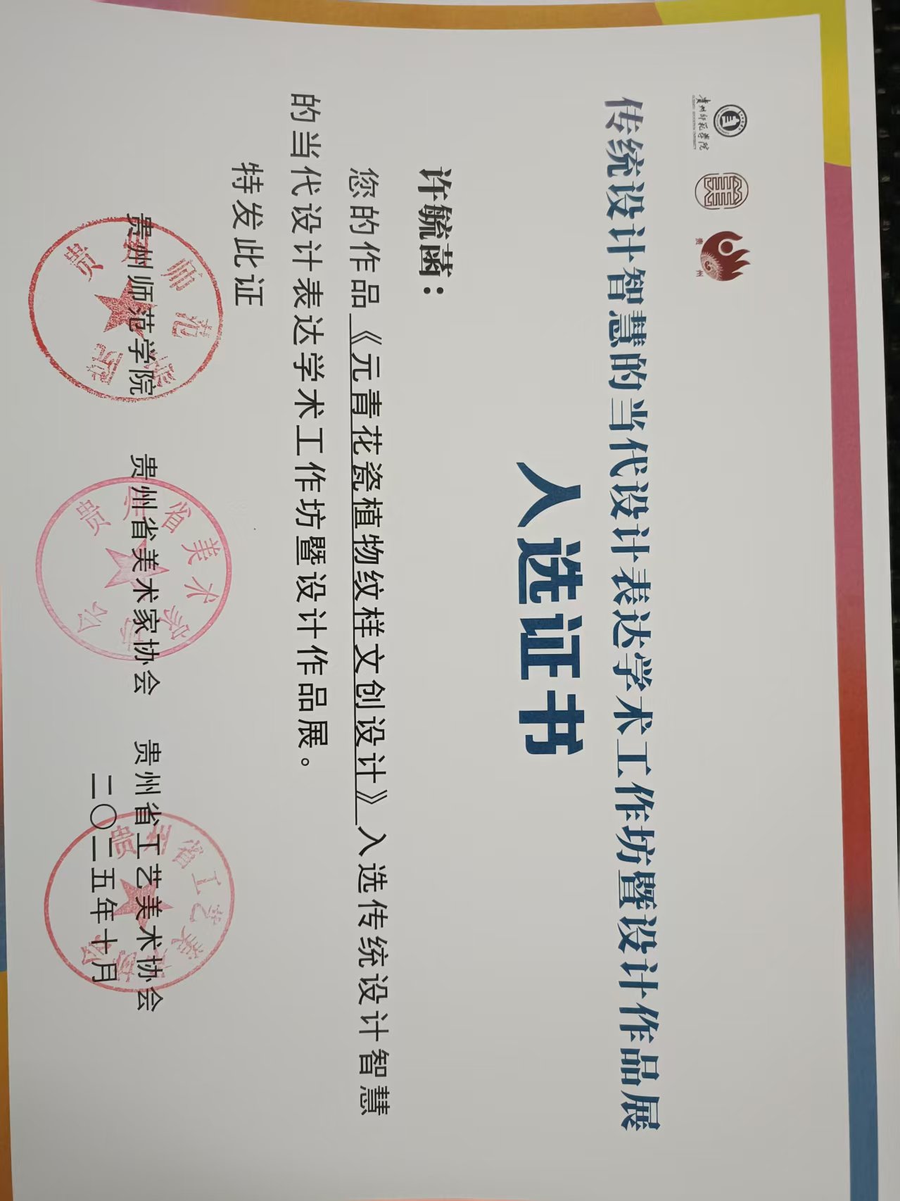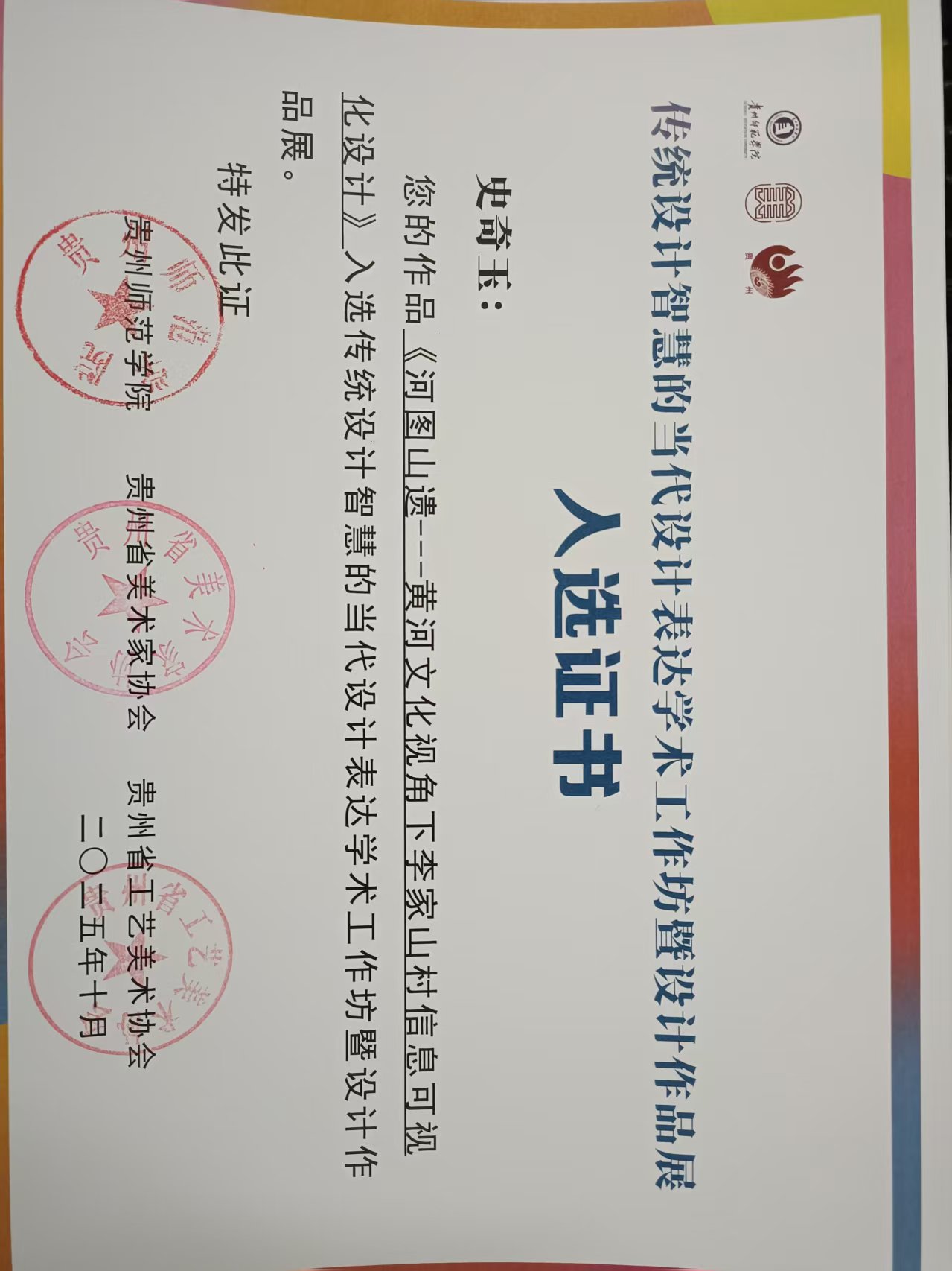 近日,由贵州省美术家协会、贵州省工艺美术协会、贵州师范学院联合主办的“传统设计智慧的当代设计表达学术工作坊暨设计作品展”入选结果揭晓,我院吴铻彤(指导教师:陈美序)、许毓菡(指导教师:康莉)、韩晓冉(指导教师:刘鸣鸣)、史奇玉(指导教师:刘昂)四位同学的作品凭借对传统设计智慧的创新诠释成功入选,充分展现了我校在设计专业教学与实践中的卓越成果。