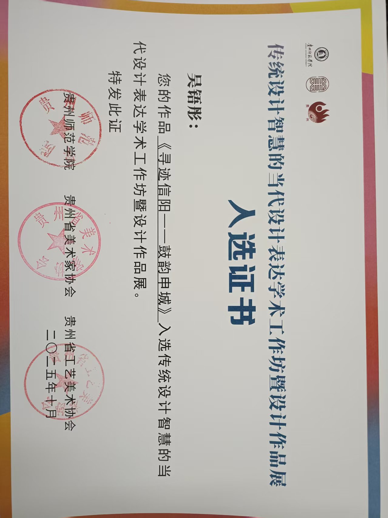 近日,由贵州省美术家协会、贵州省工艺美术协会、贵州师范学院联合主办的“传统设计智慧的当代设计表达学术工作坊暨设计作品展”入选结果揭晓,我院吴铻彤(指导教师:陈美序)、许毓菡(指导教师:康莉)、韩晓冉(指导教师:刘鸣鸣)、史奇玉(指导教师:刘昂)四位同学的作品凭借对传统设计智慧的创新诠释成功入选,充分展现了我校在设计专业教学与实践中的卓越成果。 此次作品入选,是对我院人才培养成效的有力肯定。我院始...