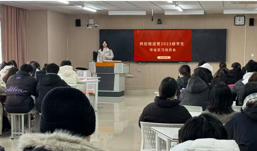 为扎实推进毕业实习工作,强化实践教学管理,帮助学生明确实习目标、增强纪律与安全意识,12月19日上午,供应链运营专业2026届毕业生实习动员会在三教114召开。本次会议由供应链管理教研室副主任吴越主持,供应链运营专业2023级全体学生及供应链教研室全体教师参加会议。
