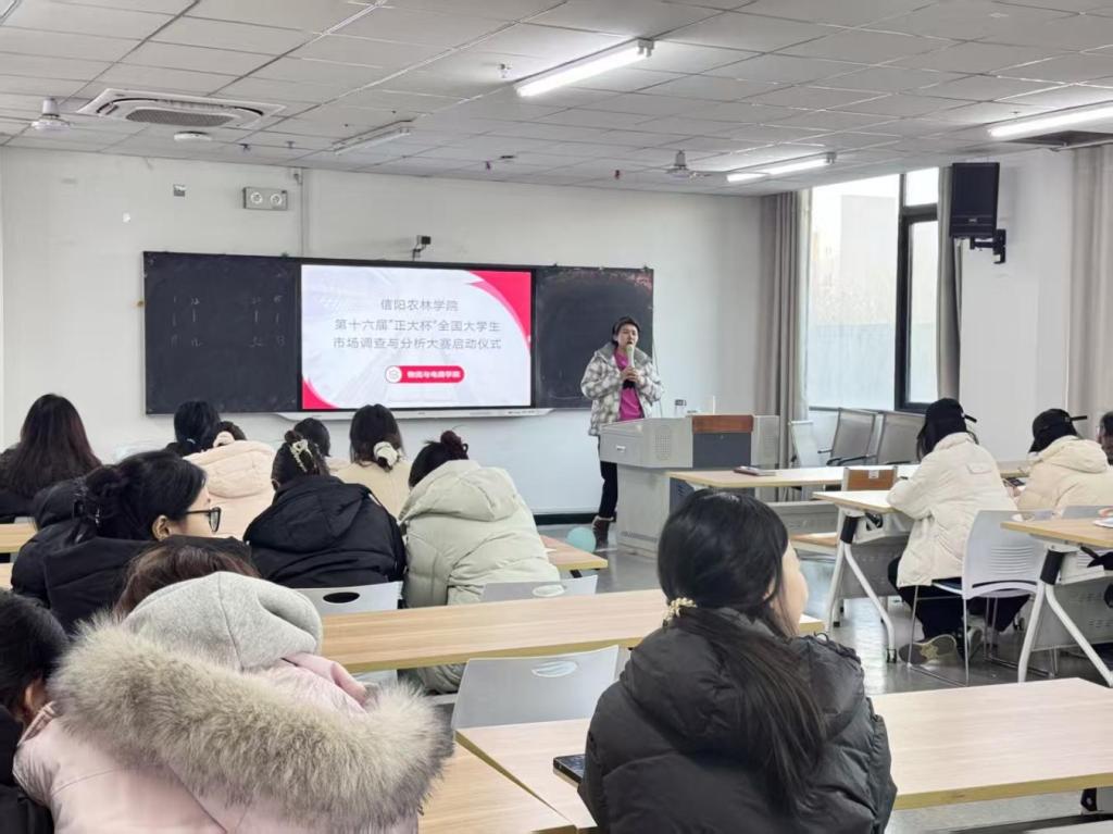 1月6日,信阳农林学院第十六届“正大杯”市场调查与分析大赛启动仪式在双创中心205隆重举行。本次大赛由物流与电商学院市场营销教研室主办,以“数智赋能·洞察未来”为主题,聚焦乡村振兴、消费趋势、新兴产业等热点方向,吸引了35支队伍、160余名学子踊跃报名,创历史新高。物流与电商学院副院长张世军教授、市场营销教研室和电子商务骨干教师出席本次活动,共同见证大赛启幕。
