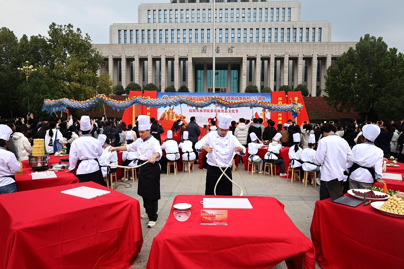 10月21日,我校第九届食品文化节于汝宁广场开幕。信阳市人大常委会原副主任、信阳菜文化研究和产业发展促进会会长杨明忠,信阳市原畜牧局局长、信阳菜文化研究和产业发展促进会秘书长刘正国,信阳市食品安全协会秘书长吴章林,药食同膳精汤食品(信阳)有限公司董事长温继照,校党委副书记、工会主席王万玲,党委委员、副校长易军鹏、雷振山,学校相关职能部门负责同志、校企合作单位代表、师生代表参加了开幕式。开幕式由食品科学与工程学院院长李建芳主持。
