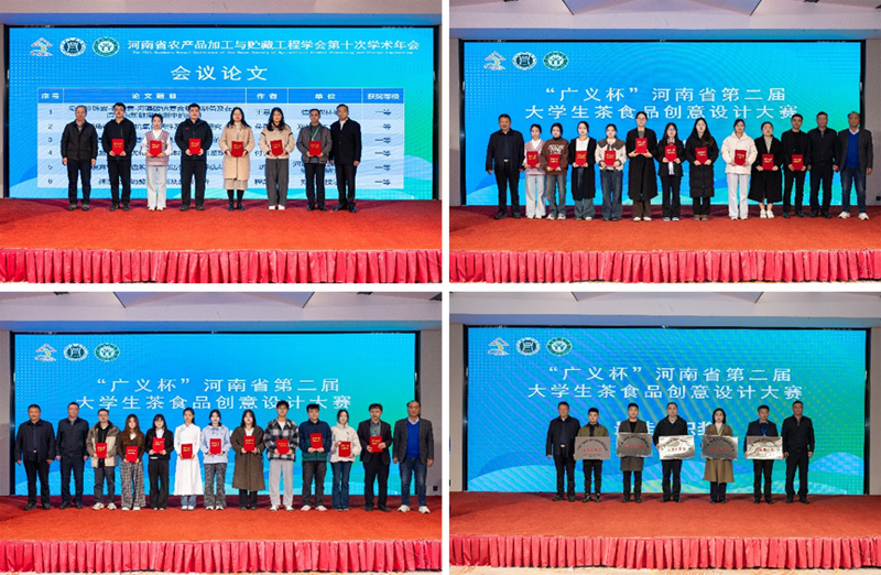 李益民、易军鹏、河南省农产品加工与贮藏工程学会监事长刘延奇和常务副理事长艾志录、信阳市广义茶叶有限公司董事长李广义分别为年会获奖论文及大学生茶食品创意设计大赛获奖单位和个人颁奖,并鼓励青年学子与科研工作者勇于创新、再创佳绩。
