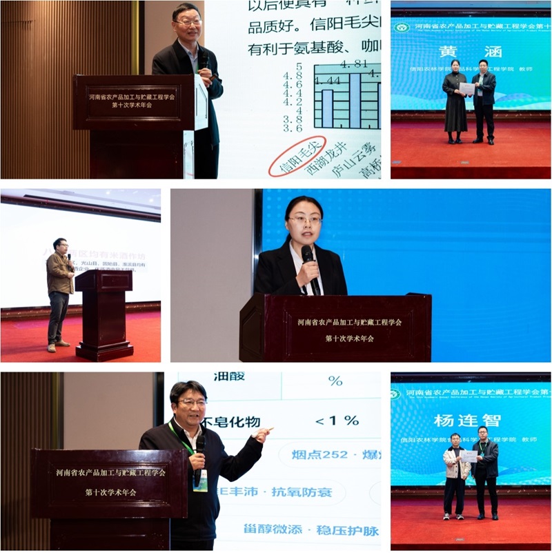 我校茶学院教授郭桂义,园艺学院院长龚守富,食品科学与工程学院博士柴瑞桉、黄涵、杨连智分别作了题为“信阳毛尖茶优异品质形成机理与工艺优化”“信阳市油茶产业发展现状与研究进展”“信阳地区市售米酒曲中优质酵母菌的筛选及鉴定”“河蟹SSOs致腐特性研究及计算机模拟靶向抑菌剂的筛选”“药食同源植物布渣叶甲醇相提取物抗菌活性成分及其作用机制的研究”的大会报告。