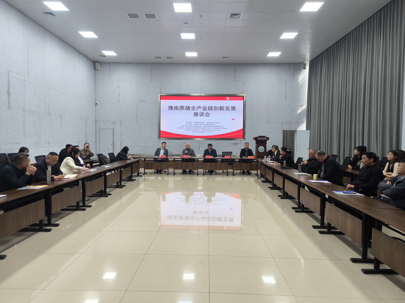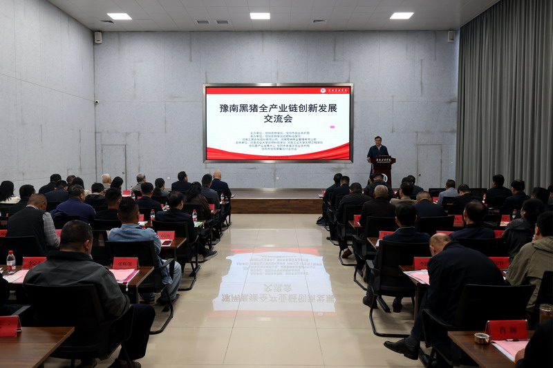 4月25日,为深入贯彻乡村振兴战略,落实信阳市品牌农业建设部署,构建政校企研产教融合平台,由我校与信阳市农业农村局共同主办的“豫南黑猪全产业链创新发展交流会”在我校举行。行业专家,各县区农业农村局分管畜牧业生产的领导及畜牧股股长,豫南黑猪保种繁育、养殖、屠宰加工等环节的经营主体和餐饮企业代表等参加会议。