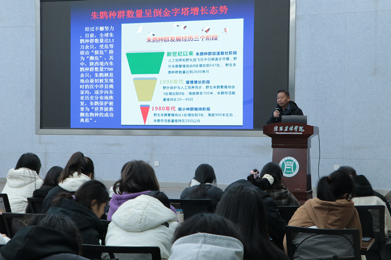 报告会上,黄治学(我校高等学历继续教育2019届园林技术专业专科生)以《我给朱鹮当“奶爸”》为题,讲述了自己30多年来在一线从事国家一级珍稀鸟类朱鹮的人工繁育、野化训练、野外放飞、野外监测观察研究等工作的心路历程。他重点分享了在朱鹮鸟类行为学研究及人工饲养、放飞监测等方面取得的经验做法和关键技术,为拯救和保护“国宝”朱鹮,扩大种群规模做出的突出贡献。