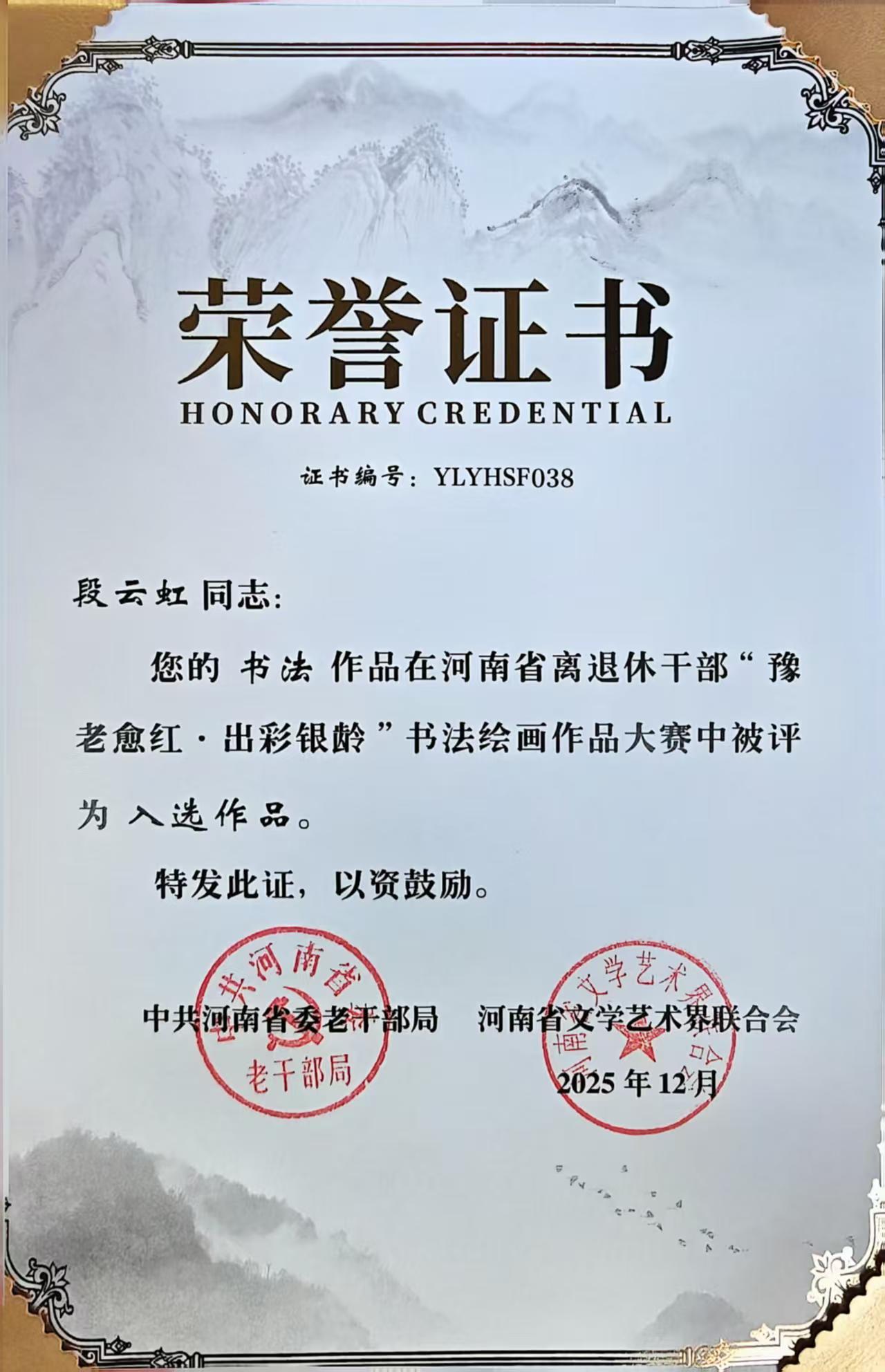 近日,中共河南省委老干部局、河南省文学艺术界联合会联合发布《关于表扬河南省离退休干部“豫老愈红·出彩银龄”书法绘画作品大赛获奖作品的通报》(豫老文〔2025〕98号),对在全省离退休干部书法绘画作品大赛中涌现出的优秀作品及作者予以通报表扬。我校离退休教师段云虹创作的书法作品《乐毅论》脱颖而出,成功入选书法类获奖作品,展现了我校老同志深厚的艺术修养和昂扬的精神风貌。