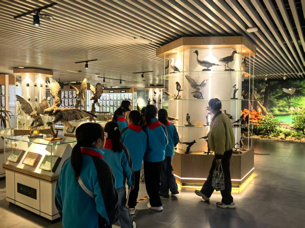 随后,研学团队抵达信阳农林学院植物馆。课程团队结合院校科研成果,进一步深化讲解:展示馆藏的大别山珍稀植物标本时,详细说明标本采集的“黄金时间”“部位选择”等规范,手把手指导学生体验简易标本压制,传递植物学研究的严谨性;结合学院在本地植物多样性保护中的调研数据,介绍濒危植物“河南杜鹃”的保育技术,引导学生理解“保护身边植物就是保护生物多样性”,将科学认知升华为环保意识。