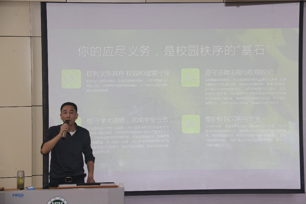 院党委副书记范阳阳对新生进行了学生日常行为规范及考核、违纪处理办法、寝室管理、防诈防骗、行为习惯教育,引导学生做好人生规划,遵守法律法规、校纪校规,廉洁守信,保护好生命和财产安全,做新时代的好青年。