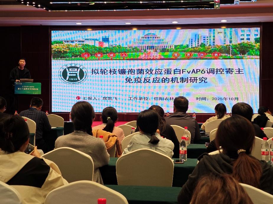 本次会议以“凝聚植病青年创新力 赋能农业农村现代化”为主题。会议期间12位行业专家作大会专题报告,52位青年教师进行了主旨报告。大会共收到论文摘要46篇,展示墙报35版。在大会报告期间,我院陈利军院长作为主持人主持了3号分会场的报告工作,教师席凯飞作了题目为《拟轮枝镰孢菌效应蛋白FvAP6调控寄主免疫反应的机制研究》的专题报告。