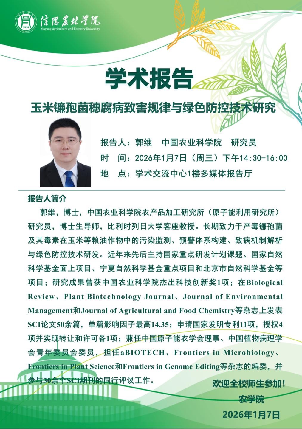 农学院第31期学术报告:玉米镰孢菌穗腐病致害规律与绿色防控技术研究
