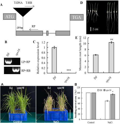 土壤盐渍化已成为全球农业生产力的重大威胁。水稻幼苗期对盐胁迫尤为敏感,然而其响应盐胁迫的分子机制尚未完全阐明。本研究通过表征一个水稻转移DNA(T-DNA)插入突变体株系OsVPS16,解析了该基因在盐胁迫耐受中的功能。实时定量PCR(RT-qPCR)分析表明,盐胁迫抑制OsVPS16的表达,而vps16突变体中该基因表达水平可忽略不计。表型分析显示,OsVPS16功能缺失能促进初生根伸长、提高存活率,从而增强盐胁迫耐受性。在盐胁迫条件下,与野生型(DJ)相比,vps16突变体地上部积累更少的Na+和更多的K+。此外,突变体表现出丙二醛(MDA)含量降低,超氧化物歧化酶(SOD)和过氧化物酶(POD)活性增强。转录组分析鉴定出盐胁迫下vps16与DJ根系间存在1236个差异表达基因(DEGs)。功能富集分析表明,这些DEGs主要富集于蛋白丝氨酸/苏氨酸激酶活性、Ca2+信号通路和MAPK信号通路。值得注意的是,关键蛋白激酶(OsSRK1、OsCDPK21)和转录因子(OsNAC45)的上调表达,可能是OsVPS16突变介导盐胁迫耐受性的重要机制。综合生理学和分子生物学分析表明,OsVPS16功能缺失通过多重机制提高水稻耐盐性,包括调控K+/Na+稳态、调节抗氧化酶活性以及重编程胁迫响应基因的转录。本研究不仅揭示了一个新的水稻盐胁迫响应基因的功能,也为通过分子育种培育耐盐水稻品种提供了宝贵的遗传资源。