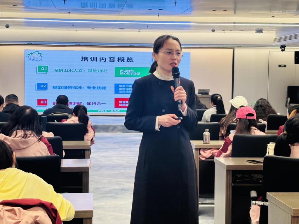 本次培训吸引庐山景区多名讲解员参与,以“夯实专业基础、规范服务标准、强化实战能力”为核心,全面检验并提升参训学员的专业素养与服务技能。培训时长1.5小时,课程内容系统全面、注重实效,紧密贴合景区讲解岗位实际需求,重点围绕讲解服务规范、实操技巧与能力提升展开,针对性极强。
