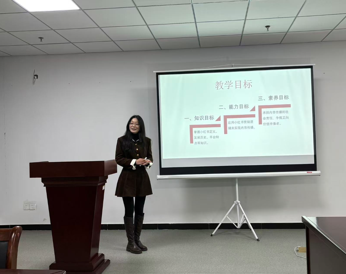 试讲环节中,三位新入职教师依次登台,围绕教授课程展开教学展示,展现了扎实的专业素养与积极的教学风貌。董艺嘉老师试讲的课程是《新媒体营销》,她聚焦“小红书分享经济”主题,从小红书的基本认知切入,深入剖析了其内容种草的核心特点,讲解细致、教态自然;丁秀老师同样讲授《新媒体营销》课程,她将焦点放在“微信公众号营销”模块,选取典型微信公众号案例,从多维度进行深度拆解,逻辑清晰、案例鲜活,为在场教师呈现了一堂生动的案例教学课;郭世娇老师则带来《网络与新媒体概论》课程的试讲,她以“网络与新媒体的经济价值”为核心内容,创新引入“景德镇鸡排哥”的热门案例,帮助学生理解聚合流量、商业变现和产业赋能的概念。