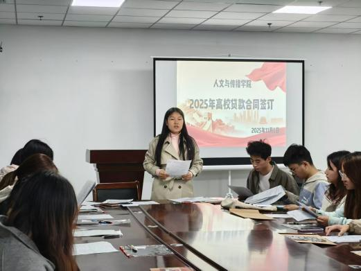 为切实做好高校助学贷款工作,深化学生诚信教育,2025年11月5日下午,人文与传播学院于学院会议室精心组织开展2025年高校助学贷款合同签订仪式暨诚信还款教育活动。资助专员李冉老师及全体高校助学贷款申请学生参与此次活动。