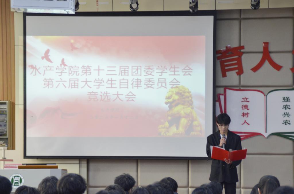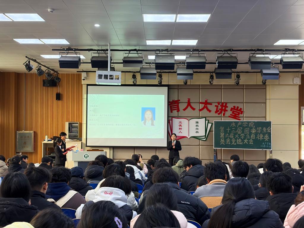 大会在庄重而热烈的氛围中拉开帷幕。参与竞选的同学依次上台发表竞选演讲,主要围绕部门职责使命、工作构想及个人优势进行了阐述。现场气氛活跃,充分展现了水产学子积极进取、乐于奉献的精神风貌。