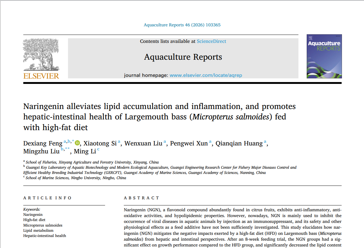 近日,我院水产动物营养健康与疫病防控团队在功能性添加剂改善鱼类高脂代谢障碍方面再次取得新进展。相关研究成果以《Naringenin alleviates lipid accumulation and inflammation, and promotes hepatic-intestinal health of Largemouth bass (Micropterus salmoides) fed with high-fat die》为题发表在《Aquaculture Reports》(JCR Q1,中科院二区)上,团队负责人冯德祥副教授为第一作者/共同通讯作者,广西科学院刘明珠为共同通讯作者。研究发现,在饲料中添加柚皮素能显著减少鱼类长期摄食高脂饲料导致的肝脏脂质沉积、减轻肝损伤,并改善肠道健康状况。该研究成果将有助于降低高脂饲料在水产养殖中的负面影响,并有望成为一种前景广阔的环境友好型水产饲料添加剂。