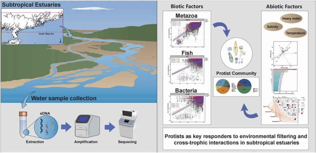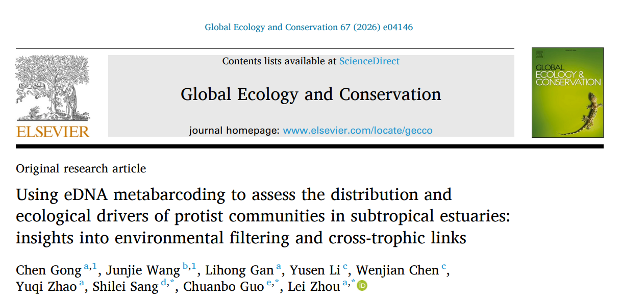 近日,我院教师桑石磊在生态与保护生物学领域的重要国际期刊《Global Ecology and Conservation》(JCR Q1,中科院二区)上发表题为“Using eDNA metabarcoding to assess the distribution and ecological drivers of protist communities in subtropical estuaries: insights into environmental filtering and cross-trophic links”的研究论文。该研究解析了亚热带河口原生生物群落(基于18S rDNA)及其与细菌(16S rDNA)等的跨营养级关联。结果表明,群落构建受到盐度、温度、重金属等环境因子的确定性过程主导,并呈现显著空间分异。共现网络分析揭示了原生生物与细菌等类群的强关联,暗示环境胁迫下的协同响应,为全球变化背景下的早期环境预警与河口可持续管理提供了科学依据。