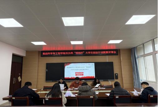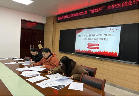 为进一步提升学生的创新精神、创业意识和创新创业能力,积极备战2026年河南省“挑战杯”大学生创业计划竞赛,3月17日下午,食品科学与工程学院在1B304会议室举行了2026年“挑战杯”大学生创业计划竞赛评审会。学院高度重视本次评审工作,特邀各教研室主任、高级职称教师以及博士代表组成8人评审专家组,对参赛项目进行了全面、细致的集中评审。