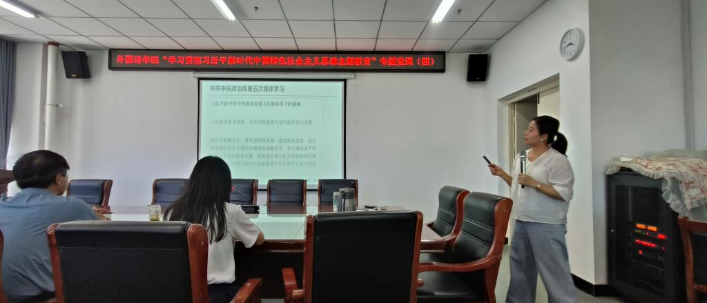 2023年6月27日下午3:30,外国语学院在文学艺术中心402会议室开展“学习贯彻习近平新时代中国特色社会主义思想主题教育”第四期专题党课——“习近平说——教育”,党课由副院长蔡鸣主讲,学院全体教职工参会。