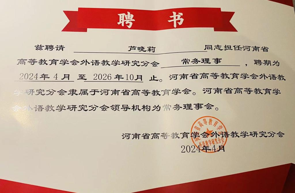 419日晚,河南省高等教育学会外语教学研究分会召开了第一届理事会第三次会议。会议选举并通过了增补副理事长、常务理事和理事人选名单。信阳农林学院外国语学院院长芦晓莉担任河南省高等教育学会外语教学研究分会常务理事。