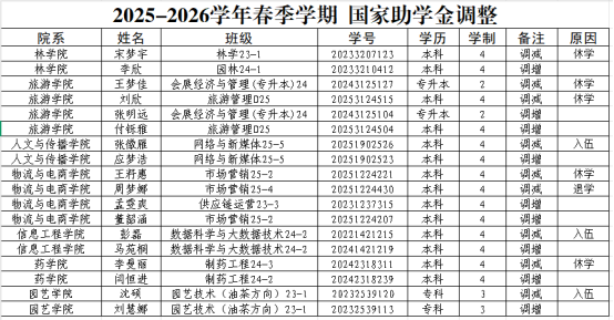 根据《河南省财政厅、河南省教育厅关于印发<河南省普通本科高校高等职业学校国家助学金管理暂行办法>的通知》(豫财办教〔2007〕114号)、《财政部 教育部 人民银行 银监会关于进一步落实高等教育学生资助政策的通知》(财科教〔2017〕21号)文件精神,学校开展了受助学生资格审查工作。现对2025-2026学年春季学期国家助学金受助学生进行动态调整,名单如下: