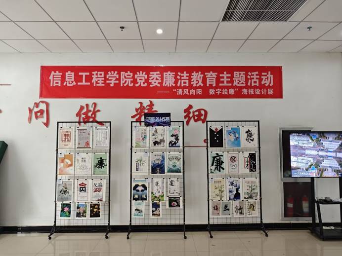 展览设置UI设计、平面设计、AIGC作品、三维建模、智能机器人、摄影作品等多元展区,特设廉洁海报设计展区,以数字艺术传递崇廉尚洁理念,筑牢师生廉洁思想防线。展览期间,学院党委组织师生党支部集体观摩,并开展“廉洁党课现场教学”,由党员教师结合作品讲解廉洁自律要求,强化思想引领。本次作品展采用传统展架与动态电子屏结合的展示形式,虚实相映吸引师生驻足,专业教师、学生互相分享创作灵感。