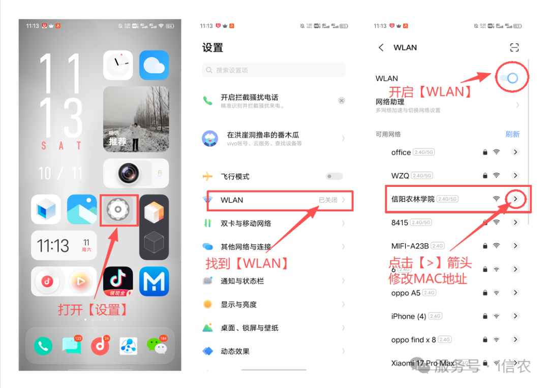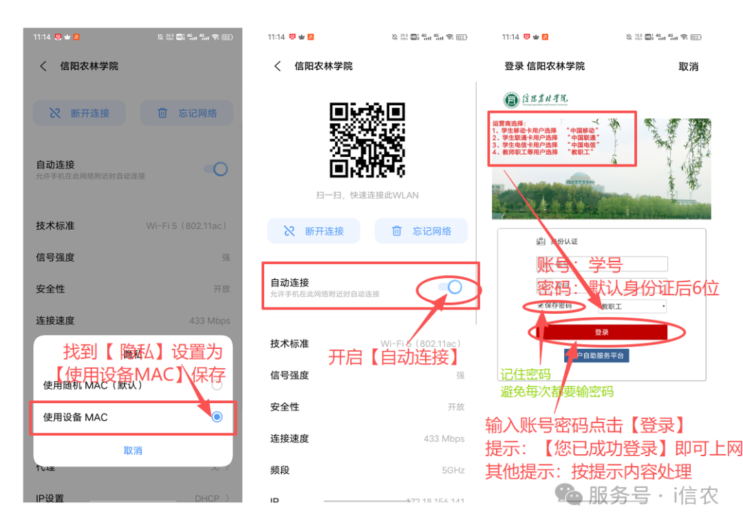 IQ00 型号OriginOS版本示例:打开【设置】—找到【WLAN】点击—开启【WLAN】—找到要连接的WiFi信号(比如“信阳农林学院”或“13-110”举例)—点击WiFi后边的【>】—找到并点击【隐私】—选择【使用设备MAC地址】—【保存】—设置完成后再次连接WiFi会自动跳转登陆页面—输入【账号:学号】【密码:默认身份证号后6位】—选择【对应运营商】—点击【登录】—显示【您已成功登录】代表登录成功,其他提示按提示操作。