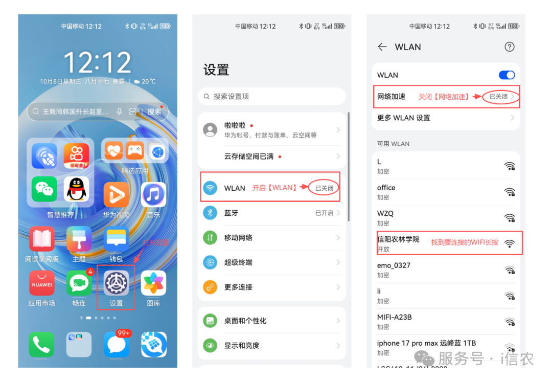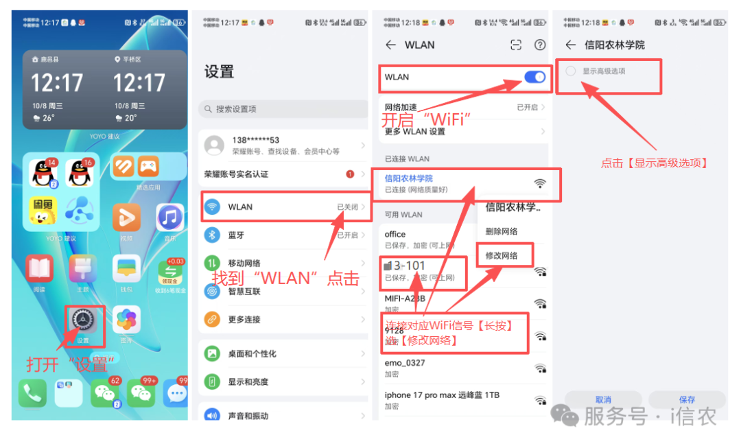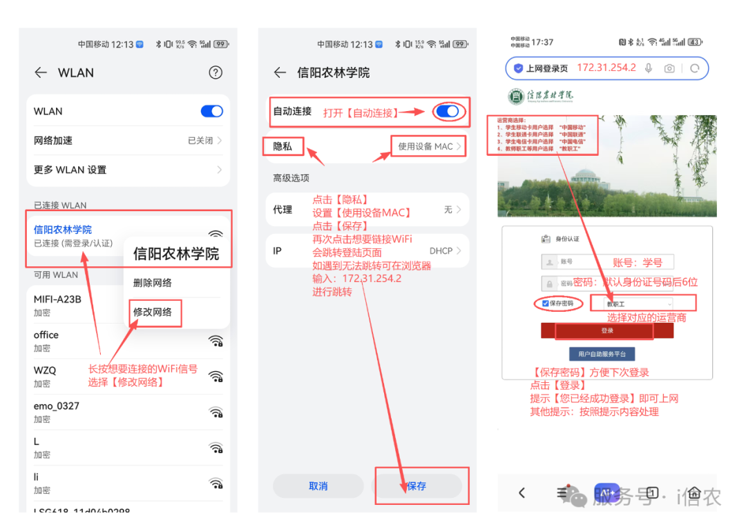华为Mate60 HarmonyOS-4.2.0版本示例:打开【设置】—找到【WLAN】点击—开启【WLAN】—找到要连接的WiFi信号(比如“信阳农林学院”或“13-110”举例)—长按【修改网络】—勾选【显示高级选项】—找到【隐私】—勾选【使用设备MAC】—【保存】—设置完成后再次连接WiFi会自动跳转登陆页面—输入【账号:学号】【密码:默认身份证号后6位】—选择【对应运营商】—点击【登录】—显示【您已成功登录】代表登录成功,其他提示按提示操作。
