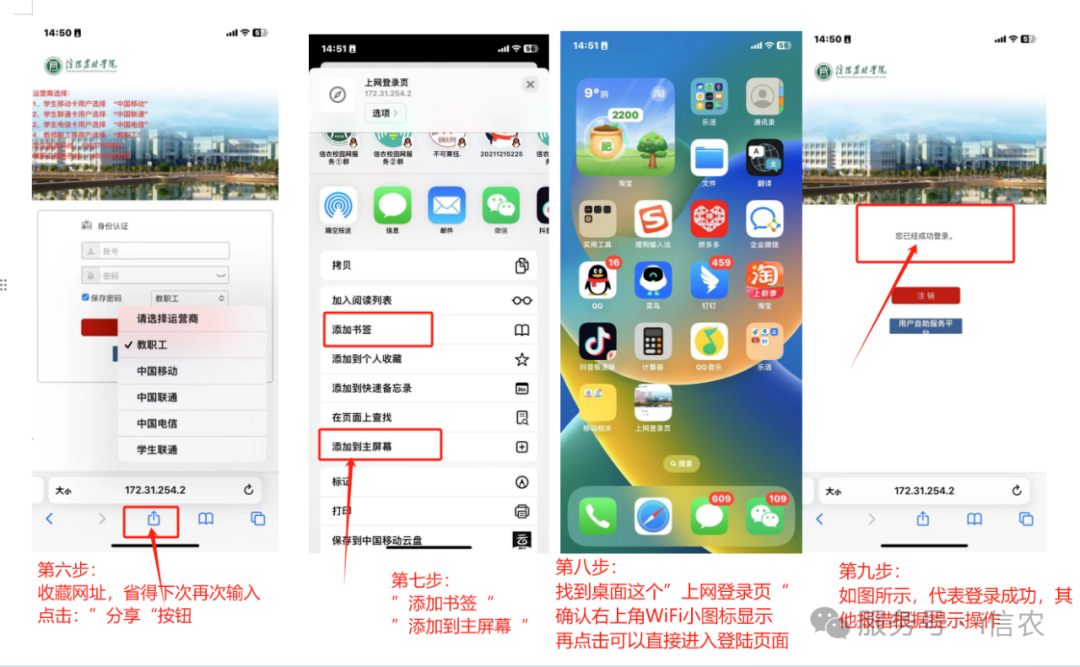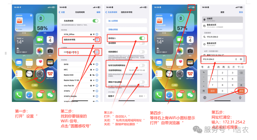 苹果11型号iOS 17 版本示例:打开【设置】—找到【无线局域网】点击—开启【无线局域网】—找到要连接的WiFi信号(比如“信阳农林学院”或“13-110”举例)—点击WiFi后边的【圆圈感叹号】—找到【私有无线局域网地址】选择关闭—点击【允许跟踪】—确认【右上角WiFi小图标】显示—打开【自带浏览器】—【网址输入栏输入:172.31.254.2】—点击【前往或搜索】—跳转到【登陆页面】点击分享按钮【添加书签】或【添加到主屏幕】方便下次登录,打开认证页面【账号:学号或工号】【密码:默认身份证后6位】—勾选【记住密码】—【选择对应运营商】点击登录—显示【您已成功登录】,代表登陆成功,其他报错信息请按照报错提示信息处理。
