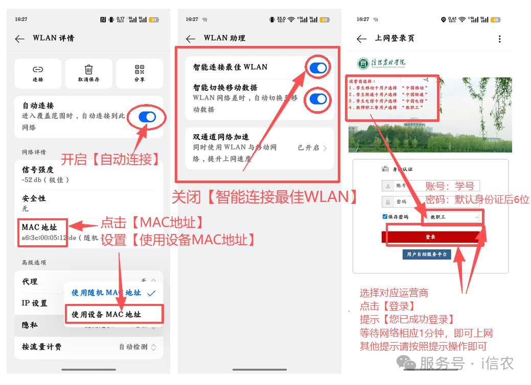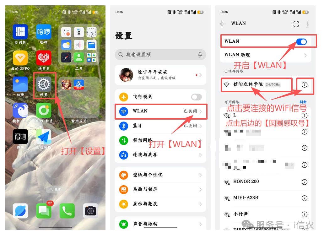 OPPO A5Pro ColorOS 15.0版本示例:打开【设置】—找到【WLAN】点击—开启【WLAN】—找到要连接的WiFi信号(比如“信阳农林学院”或“13-110”举例)—点击WiFi后边的【圆圈感叹号】—开启【自动连接】—点击【MAC地址】—选择【使用设备MAC地址】—【保存】—找到【WLAN助理】—关闭【智能连接最佳WLAN】—设置完成后再次连接WiFi会自动跳转登陆页面—输入【账号:学号】【密码:默认身份证号后6位】—选择【对应运营商】—点击【登录】—显示【您已成功登录】代表登录成功,其他提示按提示操作。