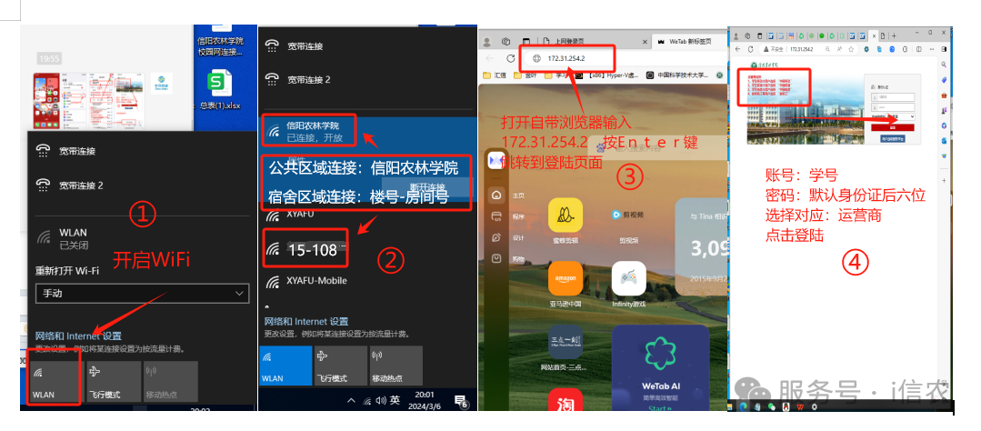开启【WiFi】—连接对应的WiFi信号(【信阳农林学院】或【楼号-房间号】)—确认连接成功,打开【自带浏览器】—网址清空后,输入【172.31.254.2】跳转登陆页面—输入【账号:学号】【密码:默认身份证号后6位】—选择【对应运营商】—点击【登录】—显示【您已成功登录】代表登录成功,其他提示按提示操作。