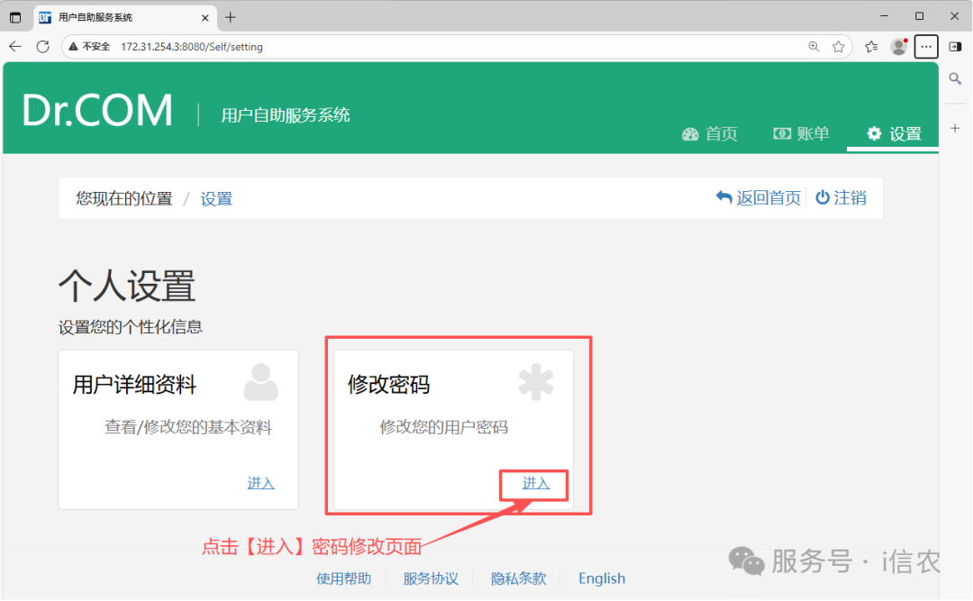 连接【校园WIFI】—打开【自带浏览器】输入【172.31.254.2】—进入【全光网登陆页面】—点击【用户自助服务系统】或在连接校园WiF前提下输入http://172.31.254.3:8080/Self/login/?302=LI —账号密码和现有的WiFi账号密码一样—点击【登录】—登陆成功后点击【设置】—点击【修改密码】—输入原密码后,按照密码修改格式要求【设置新密码】—点击【提交】,提交后需要重新使用新密码进行登录认证全光网。