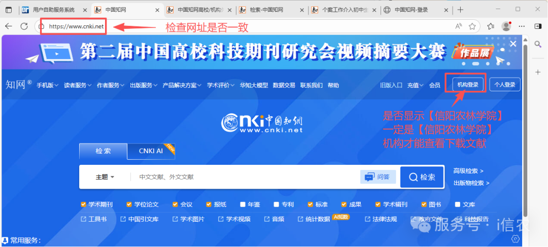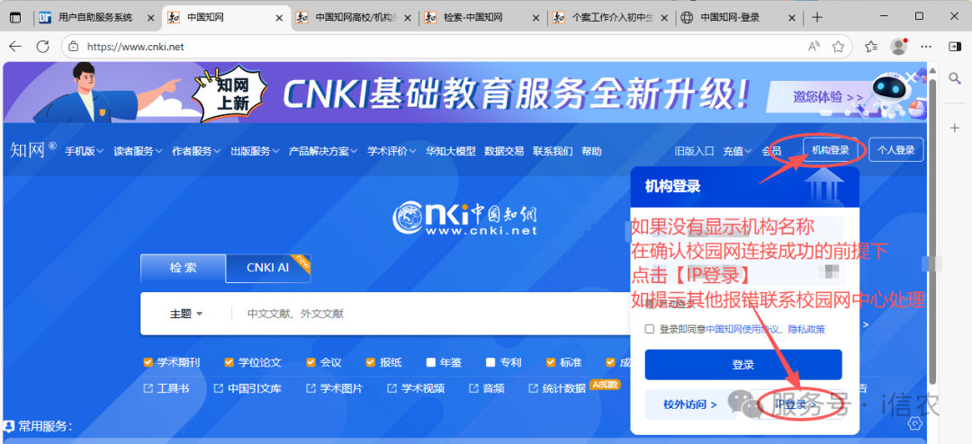 首先确认【全光网是否认证成功】,如果连接成功,打开【中国知网:https://www.cnki.net/】官网,选择要下载的文献是否可以查看和下载,如果无法访问,检查右上角【机构登录】是否为【信阳农林学院】机构,如果不是,点击【机构登录】—点击【IP登录】,再次查看是否可以查看和下载文献。如果还有其他报错联系:图书馆4楼校园网第三方服务中心416A房间电话:19837680651