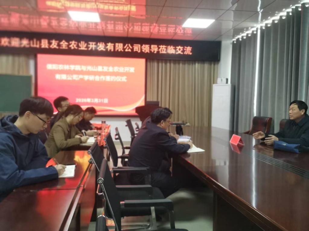 2026年3月31日,信阳农林学院与光山县友全农业开发有限公司在园艺学院2A322会议室隆重举行产学研合作协议签约仪式。光山县友全农业开发有限公司总经理胡友全应邀到校,双方围绕校企协同创新、推动豫南露地黄桃产业提质升级展开深入交流。