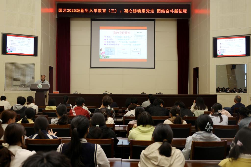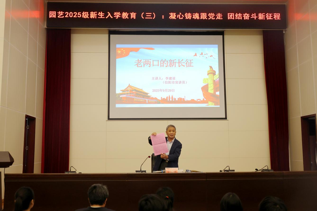 9月29日,信阳市宣讲团以“凝心铸魂跟党走,团结奋斗新征程”为主题在图书馆学术交流中心为园艺学院2025级新生开展入学教育。信阳市宣讲团成员,校宣传部相关负责同志,园艺学院教师及2025级新生代表参加活动。