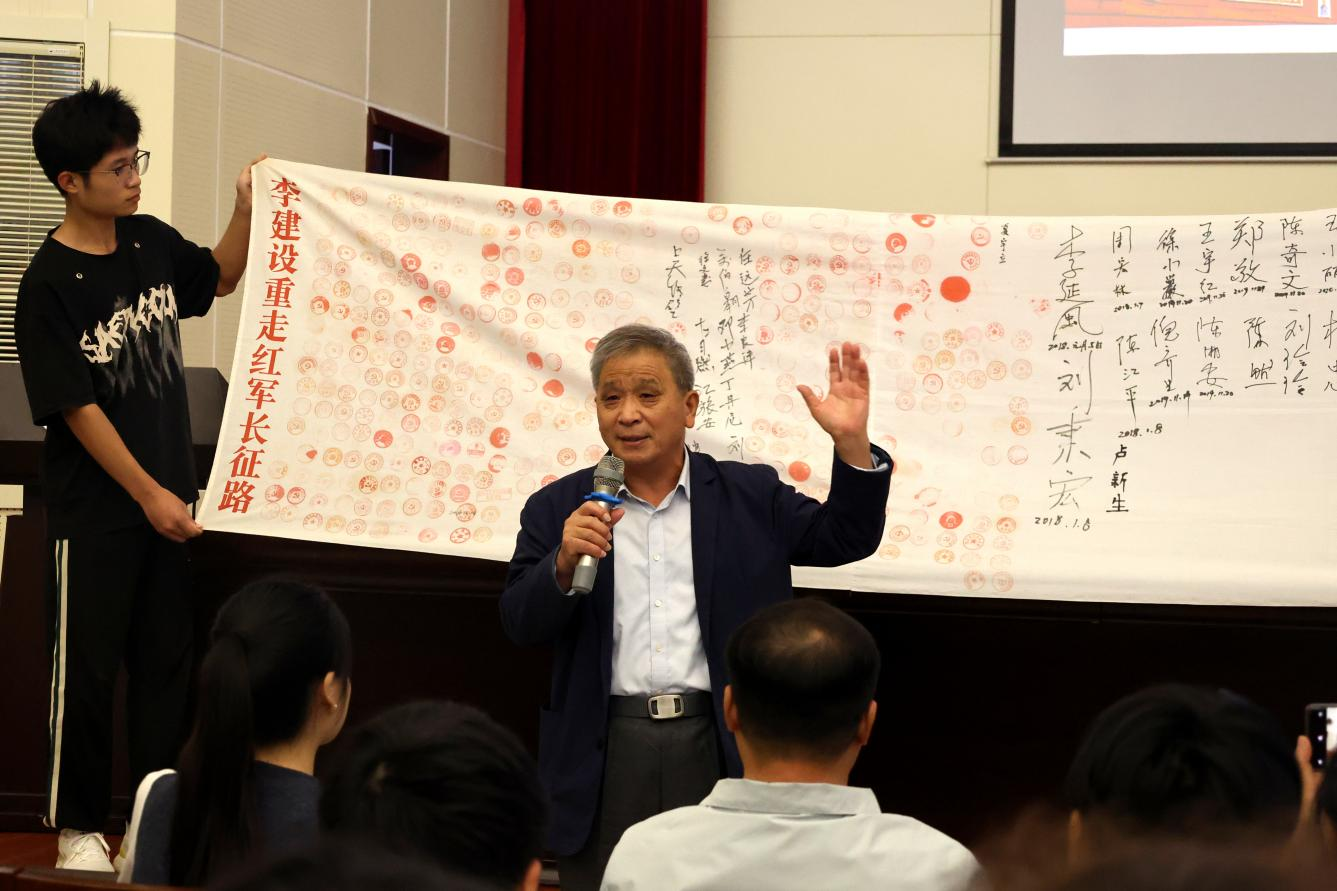 本次新生入学教育特邀信阳市“上好思政课”宣讲团成员:信阳市第九小学教师付宗英、平桥区文化新闻出版局退休干部李建设、光山县红色文化宣传教育中心宣教股股长李颖和信阳农林学院教授王宝刚主讲。四位宣讲者分别以《青春视角下的家乡六维密码》、《老两口的新长征》、《英雄》、《中国梦劳动美—凝心铸魂跟党走 团结奋斗新征程》为题,结合自身经历与专业领域,带来多维度精神分享。活动现场气氛热烈,宣讲者们用生动的语言、鲜活的事例,将思政教育融入一个个感人至深的故事中。四位宣讲者的精彩分享,赢得了现场师生的阵阵掌声。