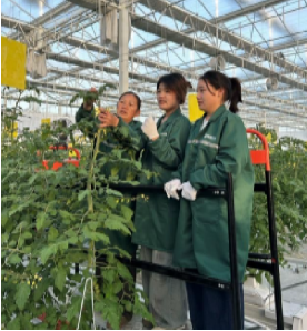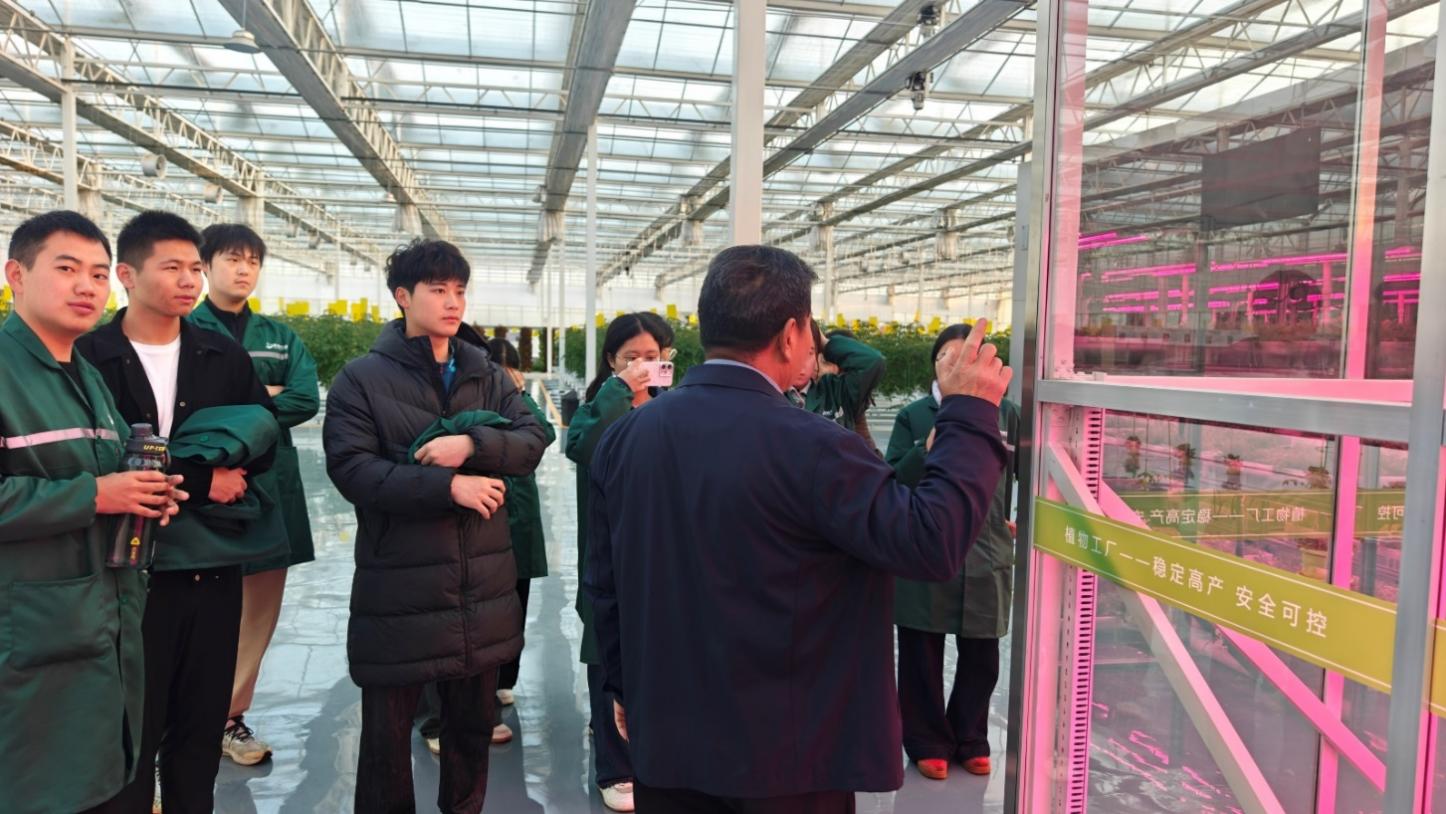 校外赋能:共富园区解锁设施农业现代化密码。实习期间,同学们奔赴信阳市共富供应链管理有限公司旗下的共富现代农业园区,开启校外实践环节。在园区技术员的协同指导下,同学们聚焦“环境控制”与“设施栽培管理”两大核心内容,深入学习设施内温度、湿度、光照、CO₂浓度的精准调控技术。接着,同学们分组开展田间实操,从作物生长状态辨识到水肥配比调整,从人工授粉到老叶修剪,将课堂所学的理论知识转化为实际操作技能,深刻体会到设施农业“技术赋能产出”的核心逻辑。
