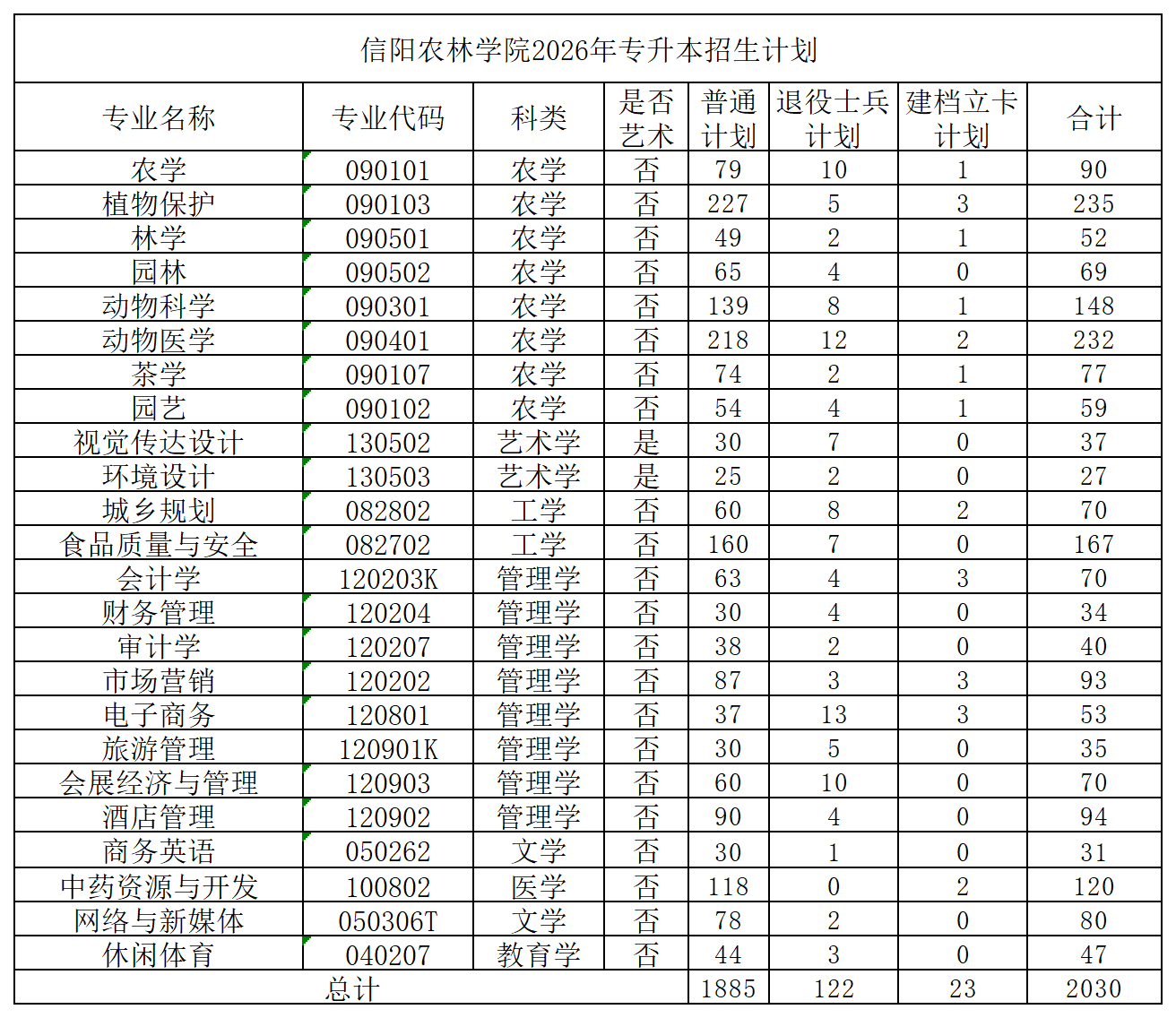 信阳农林学院2026年招收专升本2030人,其中普通计划1885人,退役士兵122人,建档立卡23人,专业计划如下,欢迎广大考生报考信阳农林学院!