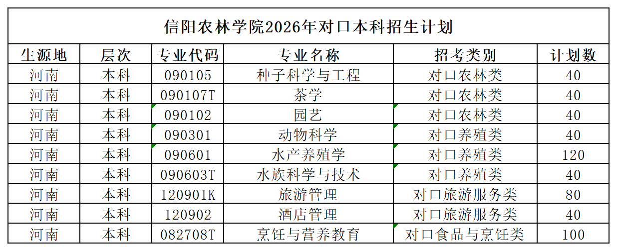信阳农林学院2026年招收对口本科540人,专业计划如下,欢迎广大考生报考信阳农林学院!