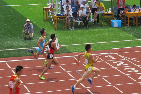 6月11日,在省第十二届运动会暨首届全民健身大会大学生田径运动会中,我校运动员张宸、张超、符用升、李旭英在男子本科甲组4*100米项目中以45秒35的成绩,突破我校2001年男子4*100米项目46秒9记录,获得本次运动会第六名好成绩!