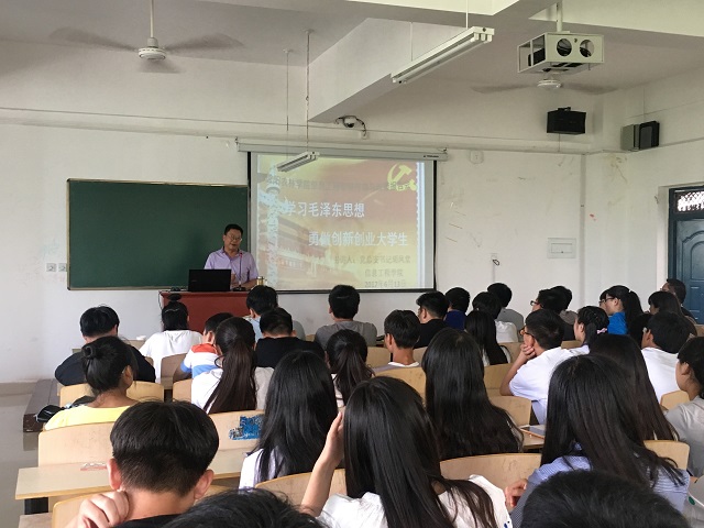 为开阔大学生创业就业思路,培养大学生的自主创业意识,6月13日下午3:00,信息工程学院党总支书记胡凤堂以《学习毛泽东思想 勇做创新创业大学生》为题,为我院2016级全体学生做了一场形势与政策报告会。