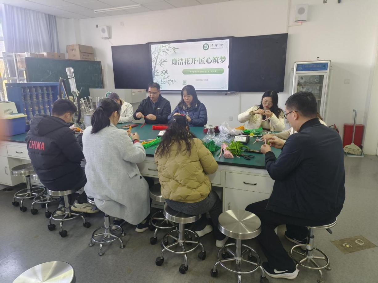 随后,在各党支部活动室中,师生党员们热情参与,利用扭扭棒等材料,亲手制作“梅兰竹菊”主题手工作品。大家在协作中交流、在创作中思考,将廉洁理念融入一花一叶、一枝一节的塑造中。