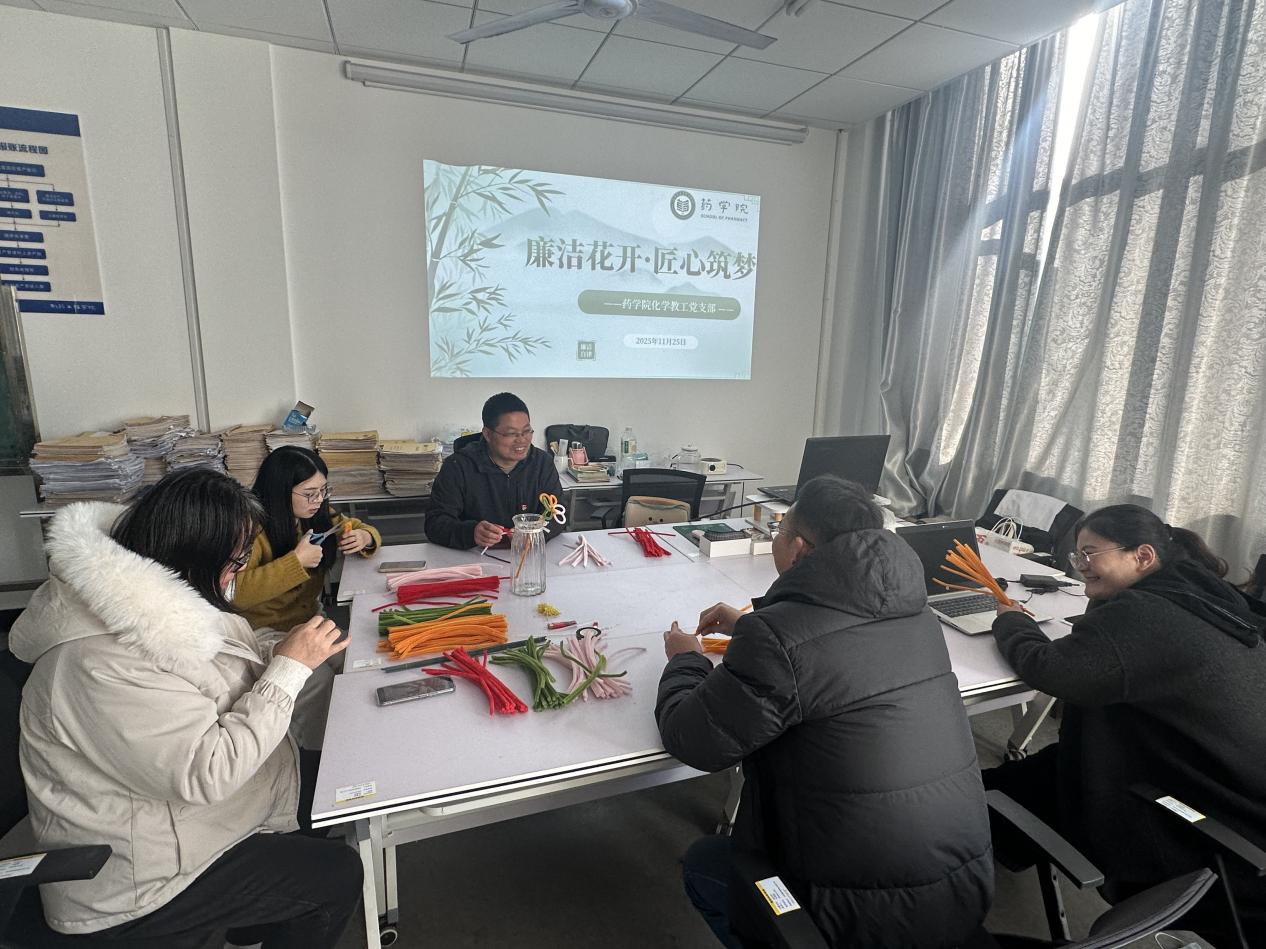 为深入推进廉洁文化建设,创新主题党日活动形式,营造风清气正的育人环境,药学院党委于2025年11月25日组织所属教工党支部和学生党支部开展了一场别开生面的主题党日活动——“廉洁花开·匠心筑梦”扭扭棒手工制作梅兰竹菊花廉洁主题作品活动。